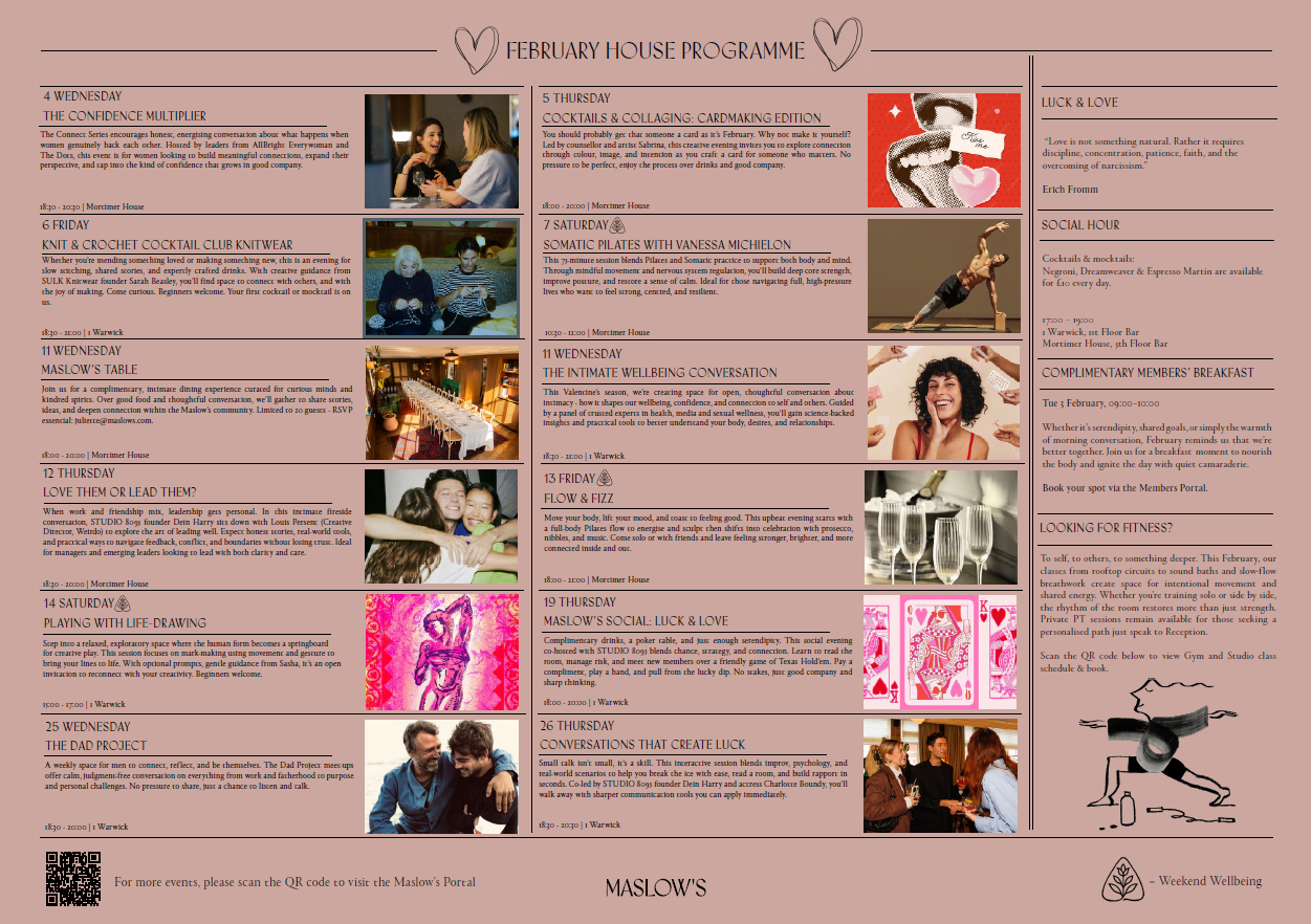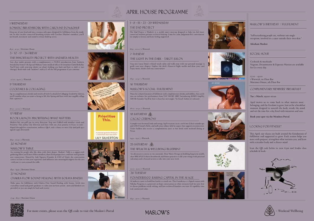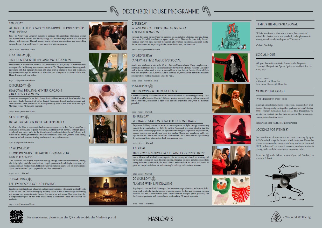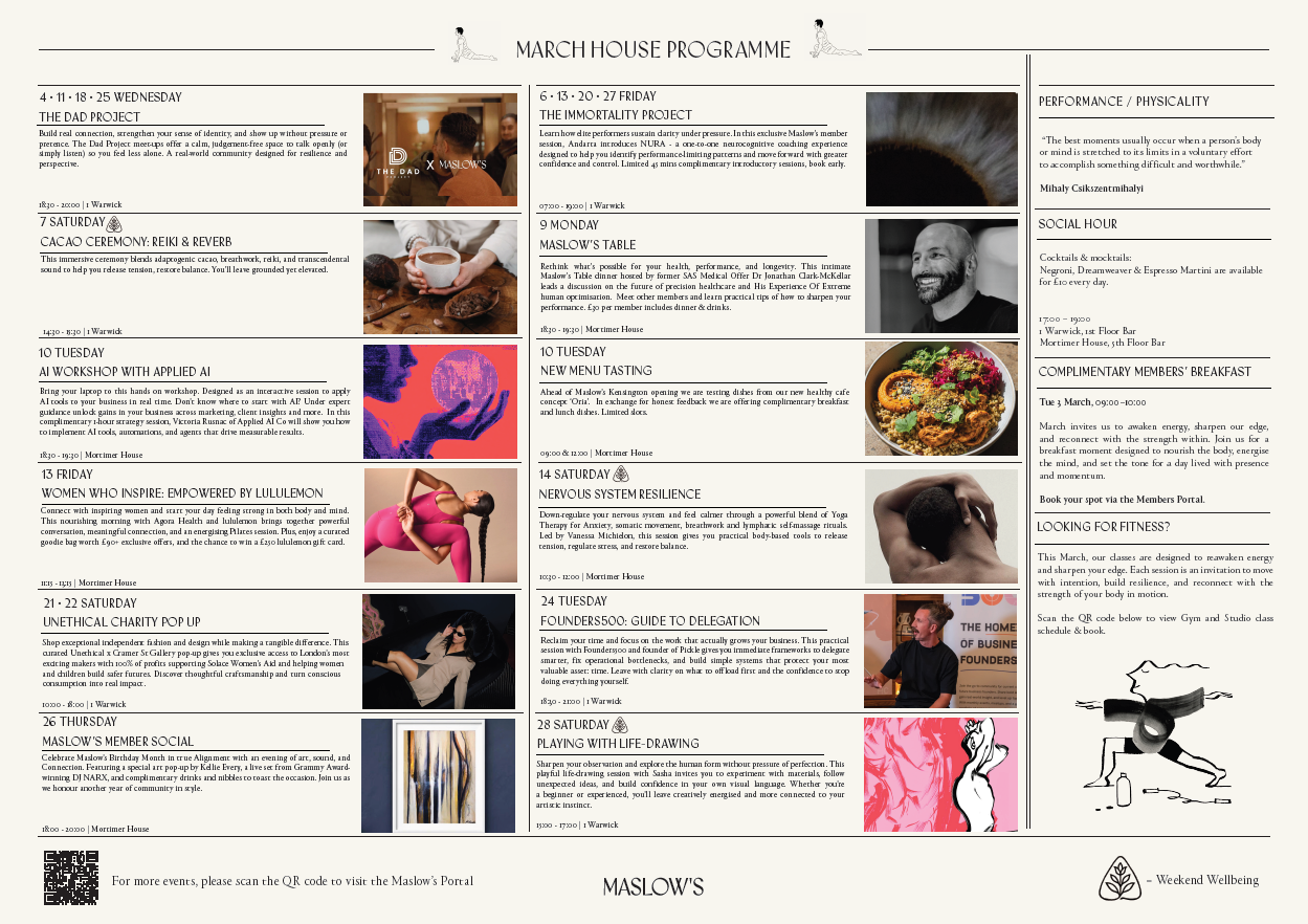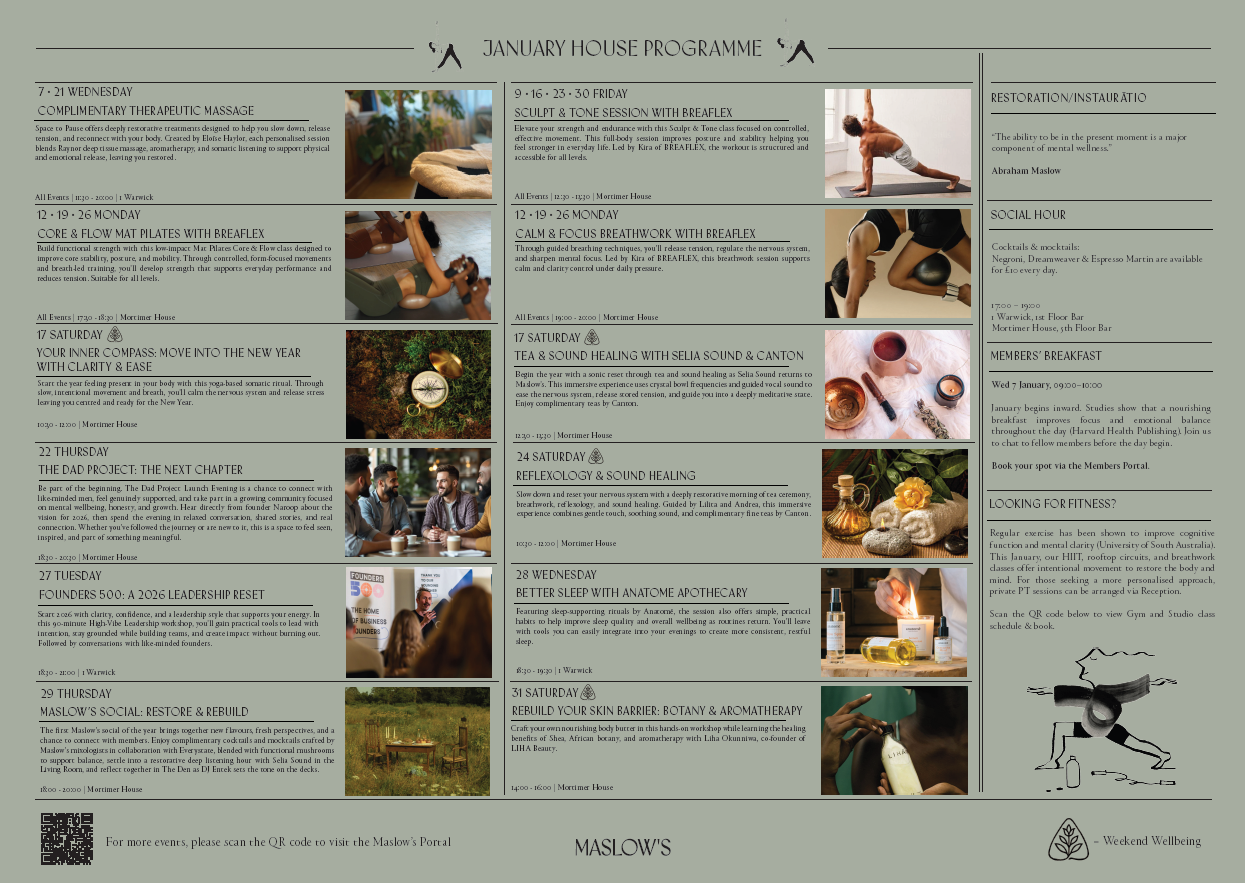 Each month our programme is centred around a unique wellbeing theme, with talks, workshops and sensory experiences that integrate both established and emerging science-based techniques. As a member, you enjoy full, complimentary access to happenings at both 1 Warwick and Mortimer House, with select weekend events also open to the wider community.